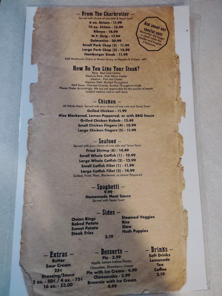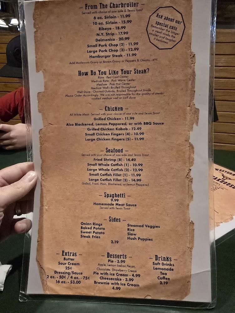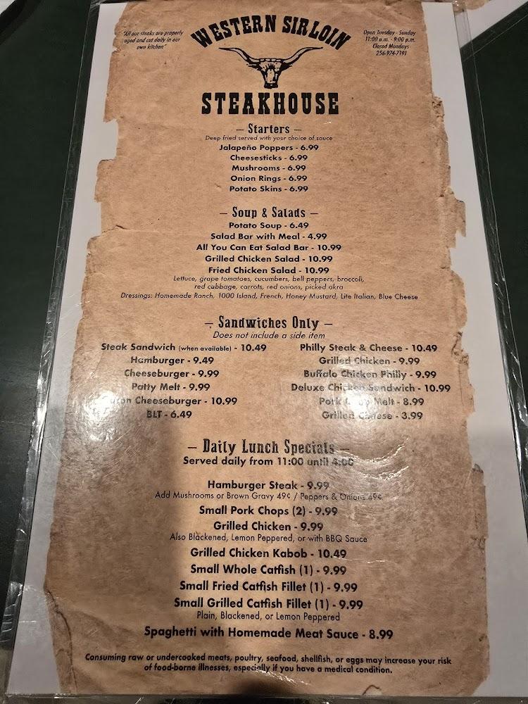 The menu at Western Sirloin Steakhouse showcases a variety of grilled dishes. Indulge in their sirloin and ribeye options, all cooked to preference. Seafood lovers can try fried shrimp or catfish.